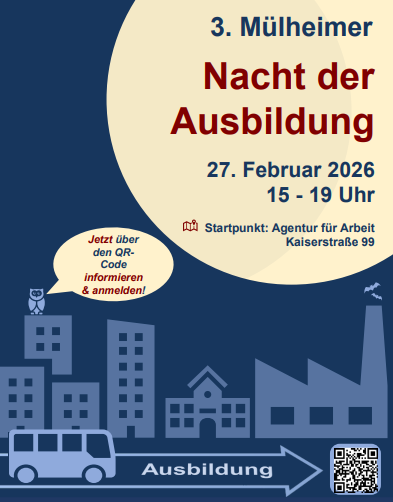Die 3. Mülheimer „Nacht der Ausbildung“ der Agentur für Arbeit und des Jobcenters Mülheim an der Ruhr sowie ihrer Kooperationspartner bietet ein innovatives Konzept für Schüler*innen und Nichtschüler*innen, die eine Ausbildung oder ein duales Studium anstreben, um sie bei ihrer Berufsorientierung zu unterstützen und mit Ausbildungsbetrieben zusammenzubringen.
