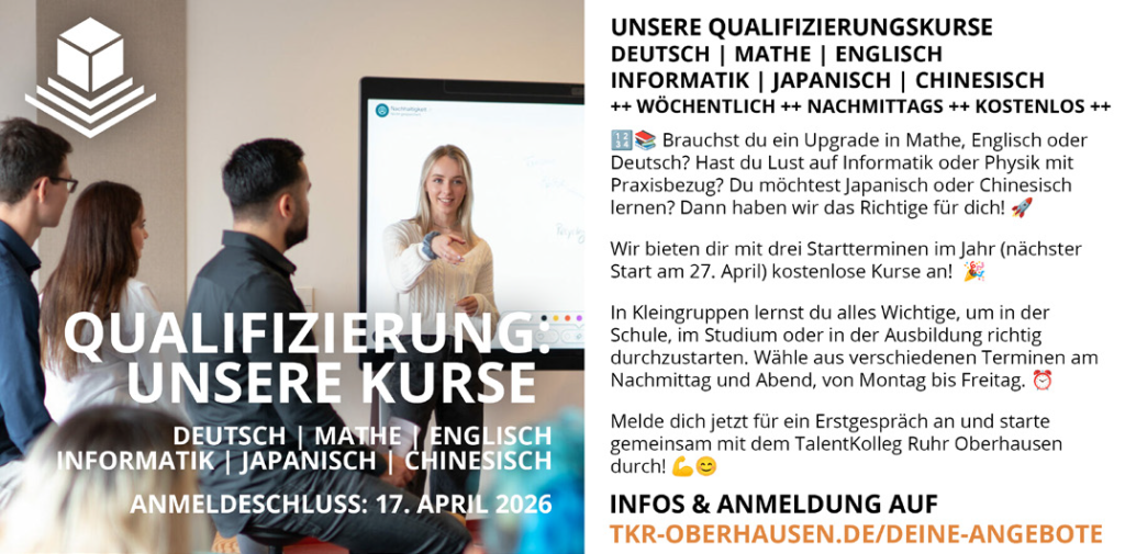 In kleinen auf dich und deinen Terminkalender abgestimmten Lerngruppen hast du im TKR Oberhausen die Möglichkeit, mit anderen motivierten Talenten gemeinsam an den Grundlagen zu arbeiten, die dir nicht nur in der Oberstufe, sondern auch bei deiner Bewerbung, deiner Ausbildung, oder deinem Studium und in deinem späteren Job ein Leben lang nützlich sind.